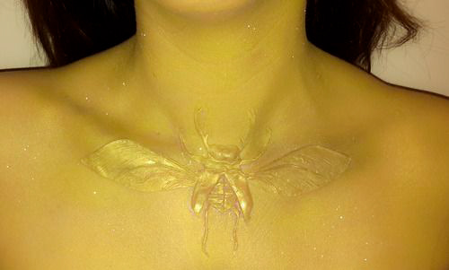 Sculpted prosthetic Stag beetle poured in liquid latex - Application, fabrication, green contacts and handmade silicon gold powered and gem head dress.